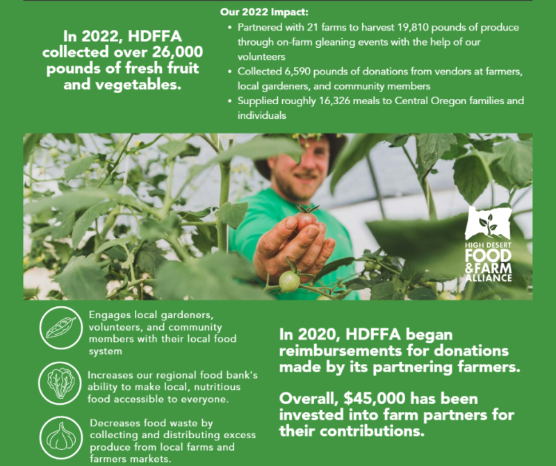 Transitioning into 2023, I anticipate that the need for fresh produce and food access will continue to grow. In light of the social and economic turmoil following the COVID-19 pandemic and recent inflation, more Central Oregonians are struggling to put nutritious food on the table. In response, the Grow & Give program will hold more harvest events, expand our network of donating farms, and continue to reimburse HDFFA Farm Partners for their produce donations to continue to bolster the local food economy. By growing and giving food together, our community invests in our food system from the seed in the farmer’s hand to the table of those who need it most. Thank you!