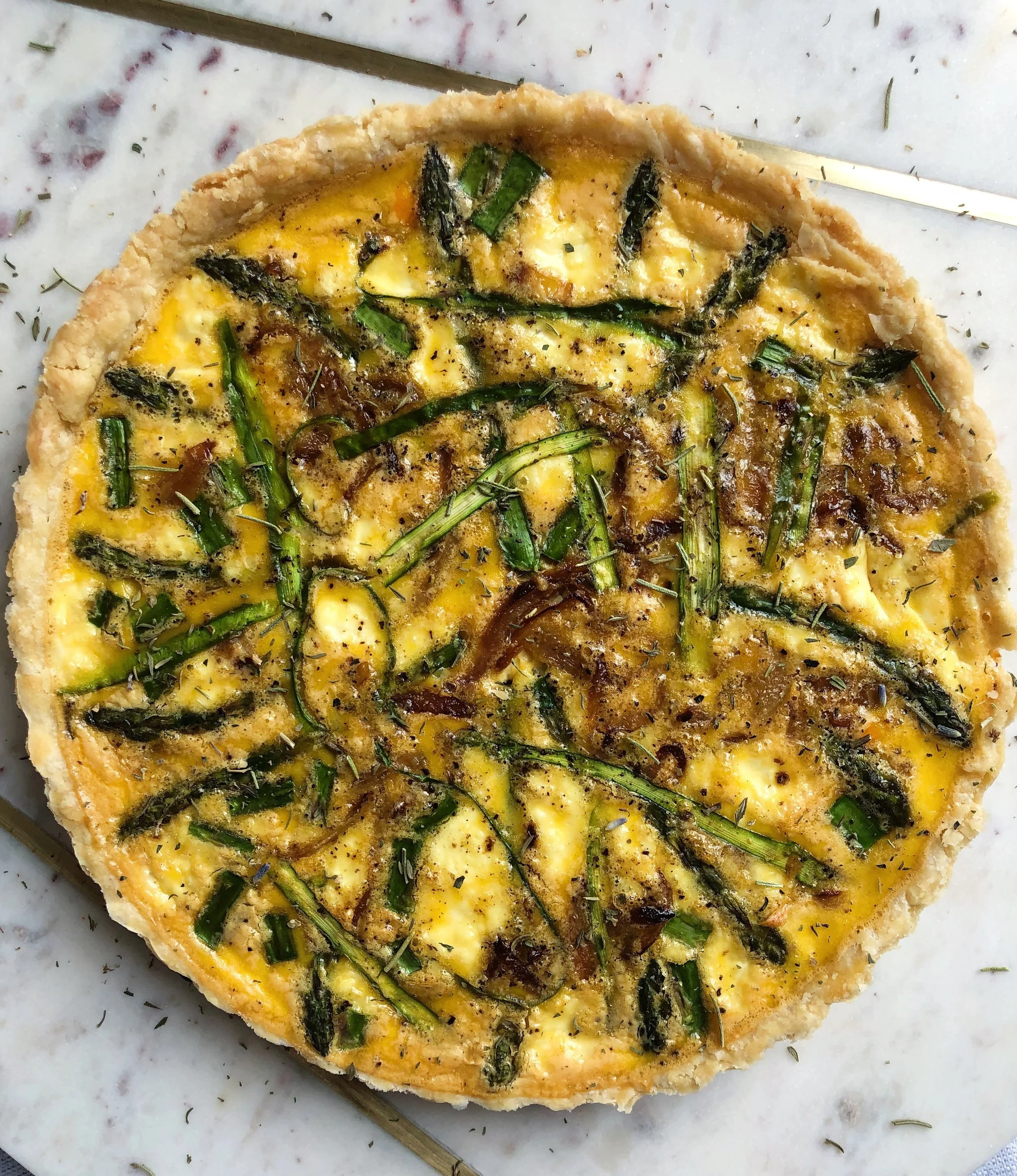 Place chopped asparagus, caramelized onion (see below), knobs of goat cheese, and herbs de Provence in the pie pan.